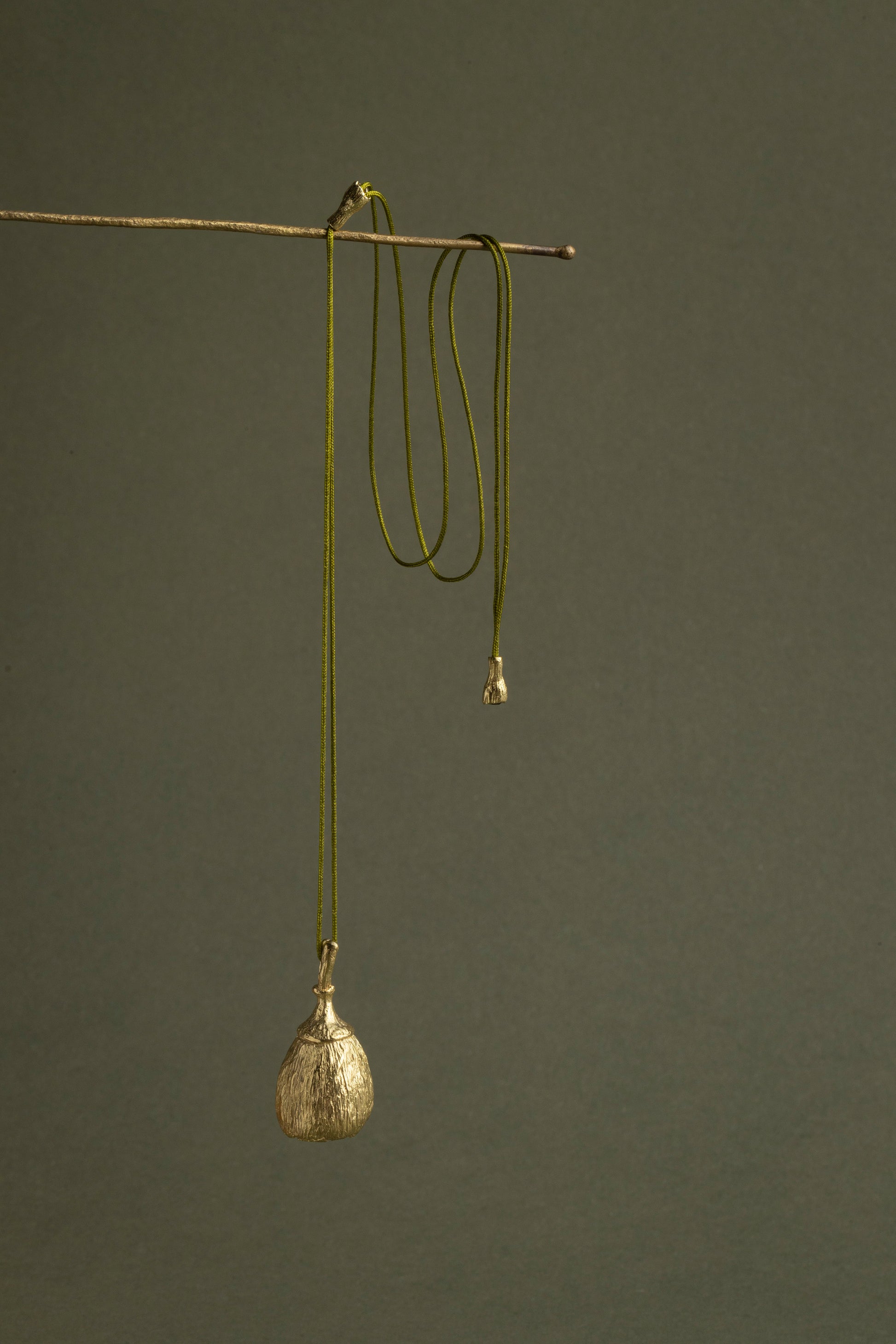 Collar en bronce con hilo negro o verde. Las semillas en los extremos del hilo permiten ajustar la altura del collar.